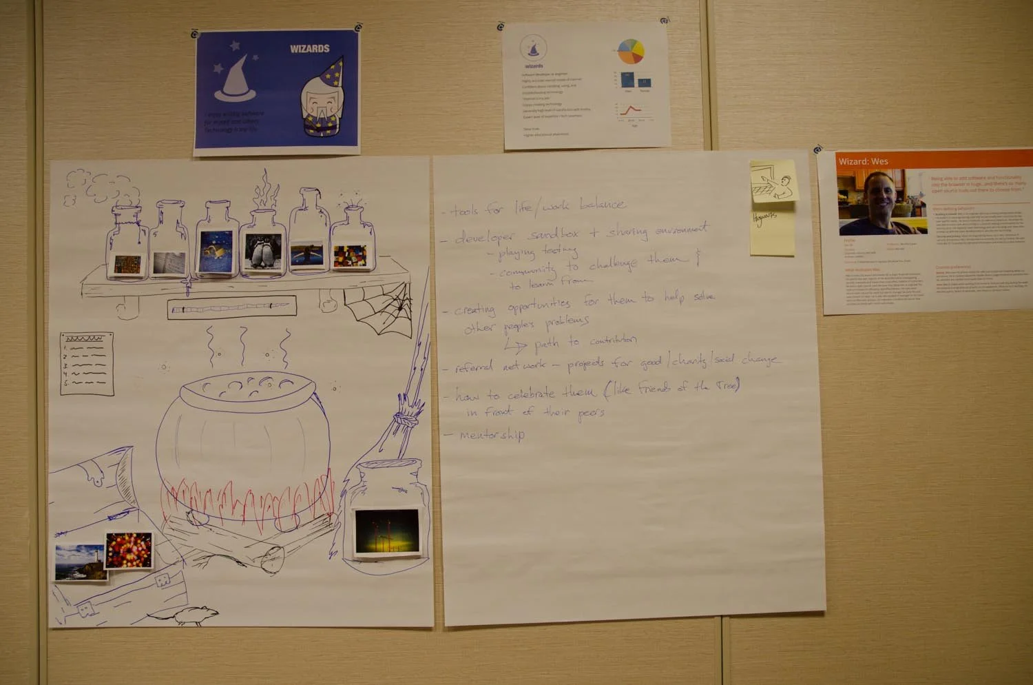 The pins were a hit and within minutes the keynote auditorium was full of Mozillians trying to trade with one another for their favorite user type. Nearly half of our community members fall into the "Wizard" category of users, but in our research this user type only represents 1% of North American Firefox users. We deliberately distributed only a few "Wizard" pins at the Summit in order to get people talking, and did it ever! As people frantically searched for these elusive pins, it gave us the opportunity to discuss the theme of our talk, "Designing for our users, not for ourselves." (Thanks to Zhenshuo Fang for her lovely user types artwork and to Madhava Enros for the pin idea!)
